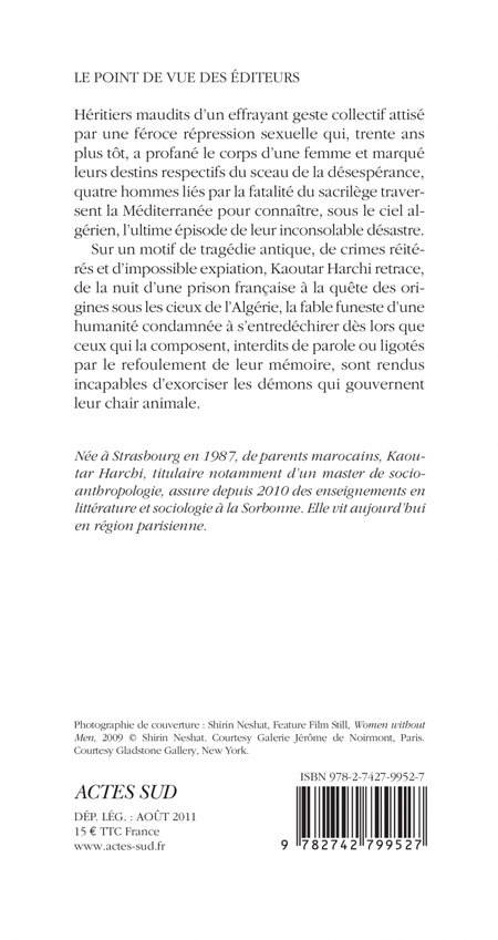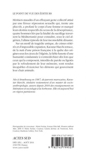 Sur un motif de tragédie antique, de crimes réitérés et d'impossible expiation, Kaoutar Harchi retrace, de la nuit d'une prison française à la quête des origines sous les cieux de l'Algérie, la fable funeste d'une humanité condamnée à s'entredéchirer dès lors que ceux qui la composent, interdits de parole ou ligotés par le refoulement de leur mémoire, sont rendus incapables d'exorciser les démons qui gouvernent leur chair animale.