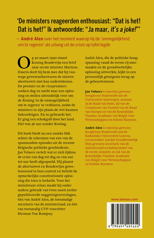 Dit boek biedt nu een unieke blik achter de schermen van een van de spannendste episodes uit de recente Belgische politieke geschiedenis. Jan Velaers vertelt wat er zich tijdens de crisis van dag tot dag en van uur tot uur heeft afgespeeld. Hij plaatst de abortuswet en Boudewijns gewetensnood in hun context en belicht de opmerkelijke constitutionele oplossing die toen is bedacht. Voor het minutieuze relaas maakt hij onder andere gebruik van twee nooit eerder gepubliceerde ooggetuigenverslagen, één van André Alen, de toenmalige secretaris van de ministerraad, en één van toenmalig CVP-voorzitter Herman Van Rompuy.