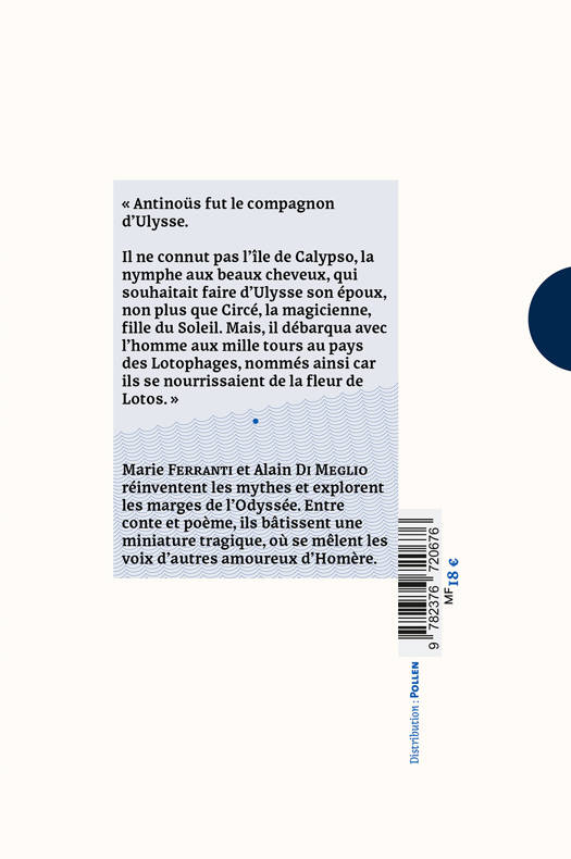 « Antinoüs fut le compagnon d’Ulysse.Il ne connut pas l’île de Calypso, la nymphe aux beaux cheveux, qui souhaitait faire d’Ulysse son époux, non plus que Circé, la magicienne, fille du Soleil. Mais, il débarqua avec l’homme aux mille tours au pays des Lotophages, nommés ainsi car ils se nourrissaient de la fleur de Lotos. »Marie Ferranti et Alain Di Meglio réinventent les mythes et explorent les marges de l’Odyssée. Entre conte et poème, ils bâtissent une miniature tragique, où se mêlent les voix d’autres amoureux d’Homère.
