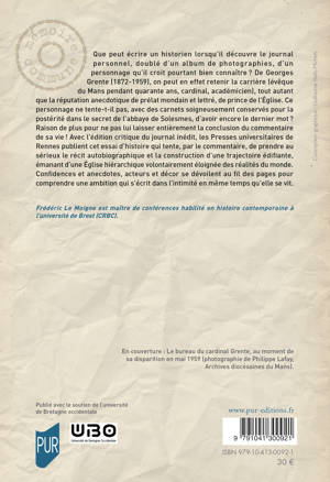 Que peut écrire un historien lorsqu’il découvre le journal personnel, doublé d’un album de photographies, d’un personnage qu’il croit pourtant bien connaître ? De Georges Grente (1872-1959), on peut en effet retenir la carrière (évêque du Mans pendant quarante ans, cardinal, académicien), tout autant que la réputation anecdotique de prélat mondain et lettré, de prince de l’Église. Ce personnage ne tente-t-il pas, avec des carnets soigneusement conservés pour la postérité dans le secret de l’abbaye de Solesmes, d’avoir encore le dernier mot ? Raison de plus pour ne pas lui laisser entièrement la conclusion du commentaire de sa vie ! Avec l’édition critique du journal inédit, les Presses universitaires de Rennes publient cet essai d’histoire qui tente, par le commentaire, de prendre au sérieux le récit autobiographique et la construction d’une trajectoire édifiante, émanant d’une Église hiérarchique volontairement éloignée des réalités du monde. Confidences et anecdotes, acteurs et décor se dévoilent au fil des pages pour comprendre une ambition qui s’écrit dans l’intimité en même temps qu’elle se vit.