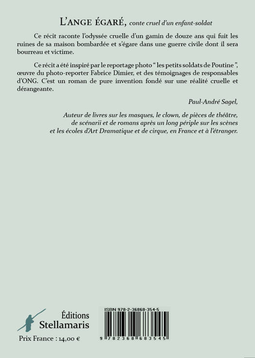 L’ange égaré, conte cruel d’un enfant-soldat Ce récit raconte l’odyssée cruelle d’un gamin de douze ans qui fuit les ruines de sa maison bombardée et s’égare dans une guerre civile dont il sera bourreau et victime. Ce récit a été inspiré par le reportage photo “ les petits soldats de Poutine ”, œuvre du photo-reporter Fabrice Dimier, et des témoignages de responsables d’ONG. C’est un roman de pure invention fondé sur une réalité cruelle et dérangeante. Paul-André Sagel,