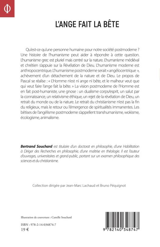 Qu'est-ce qu'une personne humaine pour notre société postmoderne ? Une histoire de l'humanisme peut aider à répondre à cette question. L'humanisme grec est pluriel mais centré sur la nature. L'humanisme médiéval et chrétien s'appuie sur la Révélation de Dieu. L'humanisme moderne est anthropocentrique. L'humanisme postmoderne serait « angélocentrique », achèvement d'un détachement de la nature et de Dieu. Le propos de Pascal se réalise : « L'Homme n'est ni ange ni bête, et le malheur veut que qui veut faire l'ange fait la bête. » La vision postmoderne de l'Homme est en fait post-humaniste, une gnose : un dualisme corps/esprit, un salut par la connaissance, un relativisme éthique, un rejet de la révélation de Dieu, un retrait du monde ou de la nature. Le retrait du christianisme n'est pas la fin du religieux, mais le retour ou l'émergence de spiritualités immanentes. Les bêtises de l'angélisme postmoderne s'appellent transhumanisme, wokisme, écologisme, animalisme.