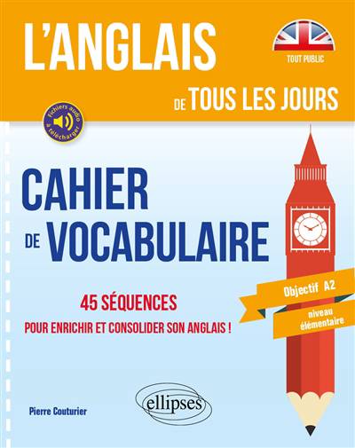Cahier de vocabulaire anglais proposant 45 courtes séquences de vocabulaire thématique avec exercices corrigés pour consolider et enrichir, en quelques minutes par jour, son vocabulaire du quotidien et ainsi, atteindre le niveau A2.