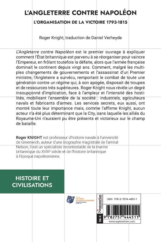 L’Angleterre contre Napoléon est le premier ouvrage à expliquer comment l’État britannique est parvenu à se réorganiser pour vaincre l’Empereur, en frôlant toutefois la défaite, alors que l’armée française dominait le continent depuis vingt ans. Comment, malgré les multiples changements de gouvernements et l’assassinat d’un Premier ministre, l’Angleterre a survécu, remportant le combat de toute une génération contre un régime qui, à son apogée, disposait de troupes et de ressources très supérieures. Roger Knight nous révèle un degré insoupçonné d’implication, face à l’ampleur et l’intensité des hostilités, mobilisant l’ensemble de la société : industriels, agriculteurs navals et fabricants d’armes. Les services secrets, eux aussi, ont montré toute leur importance mais, comme l’affirme Knight, aucun acteur n’a été plus déterminant que la City, sans laquelle les alliés du Royaume-Uni n’auraient pu être présents et victorieux sur le champ de bataille.