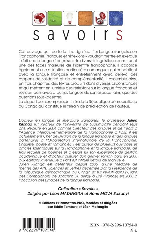 Cet ouvrage veut mettre en exergue le fait que la langue française et la diversité linguistique constituent une des faces majeures de l'identité francophone. Il accorde également une attention particulière aux langues qui cohabitent avec la langue française et entretiennent avec celle-ci des rapports de solidarité et de complémentarité. La plupart des exemples sont tirés de la République démocratique du Congo.