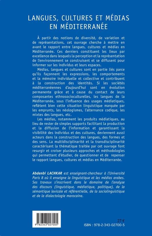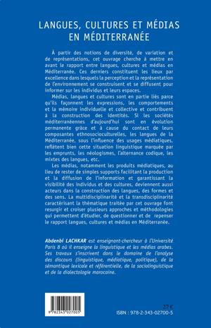 Médias, langues et cultures façonnent les expressions, les comportements et la mémoire individuelle et collective et contribuent à la construction des identités. Les langues de la Méditerranée, sous l'influence des usages médiatiques, reflètent bien cette situation linguistique marquée par les emprunts, les néologismes, l'alternance codique, les mixtes de langues, etc. Les médias demeurent ainsi acteurs dans la construction des langues, des formes et des sens.