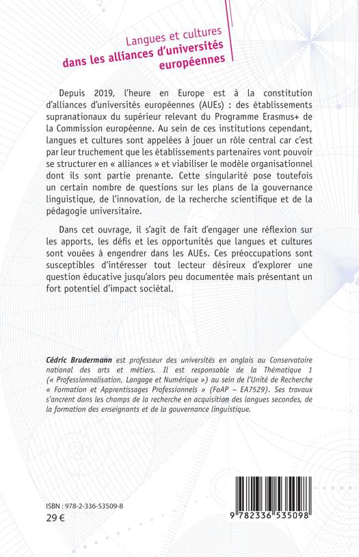 Depuis 2019, l'heure en Europe est à la constitution d'alliances d'universités européennes (AUEs): des établissements supranationaux du supérieur relevant du Programme Erasmus+ de la Commission européenne. Au sein de ces institutions cependant, langues et cultures sont appelées à jouer un rôle central car c'est par leur truchement que les établissements partenaires vont pouvoir se structurer en alliances et viabiliser le modèle organisationnel dont ils sont partie prenante. Cette singularité pose toutefois un certain nombre de questions sur les plans de la gouvernance linguistique, de l'innovation, de la recherche scientifi que et de la pédagogie universitaire. Dans cet ouvrage, il s'agit de fait d'engager une réflexion sur les apports, les défis et les opportunités que langues et cultures sont vouées à engendrer dans les AUEs. Ces préoccupations sont susceptibles d'intéresser tout lecteur désireux d'explorer une question éducative jusqu'alors peu documentée mais présentant un fort potentiel d'impact sociétal.