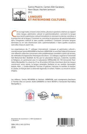 Cet ouvrage traite, à travers onze articles, plusieurs questions relatives au rapport entre langue, patrimoine culturel et patrimonialisation : comment la langue sous-tend le patrimoine culturel immatériel et comment ce dernier contribue à la protection de la langue ? Comment se concrétise le processus de patrimonialisation dans l'imaginaire collectif et dans quelles conditions? Comment certaines langues dominées ou en voie d'extinction sont « patrimonialisées » ? Dans quelles occasions sont-elles mises en avant ? etc. Les organisateurs du 1er colloque international « Langues et patrimoine culturel », coordonné par Samira MOUKRIM et Hachem JARMOUNI, se sont fixé l'objectif d'entamer une réflexion collective concernant cette problématique mondiale à partir de terrains, de méthodes et d'approches théoriques très divers. Ce colloque, organisé à l'Université Sidi Mohamed Ben Abdellah de Fès par le Laboratoire Discours, Créativité, Sociétés et Religions en partenariat avec le Laboratoire DIPRALANG EA 739 (Université Paul-Valéry Montpellier 3), a réuni du 27 au 30 octobre 2019 des chercheurs dont les travaux concernent, entre autres, la langue amazighe (berbère) et ses variétés (tamazight, kabyle, rifain...), l'arabe dialectal, l'occitan, le galicien, l'asturien, le castillan, le basque, le catalan, le français dans sa diversité régionale, le sicilien, l'italien, ou encore le slavon d 'église