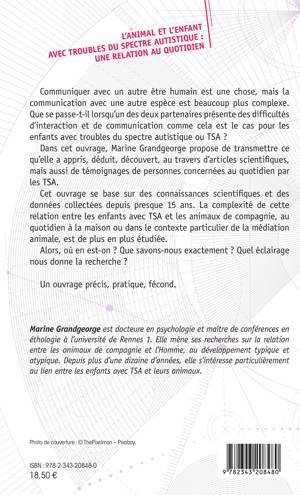 Communiquer avec un autre être humain est une chose, mais la communication avec une autre espèce est beaucoup plus complexe. Que se passe-t-il lorsqu'un des deux partenaires présente des difficultés d'interaction et de communication comme cela est le cas pour les enfants avec troubles du spectre autistique ou TSA ? Dans cet ouvrage, Marine Grandgeorge propose de transmettre ce qu'elle a appris, déduit, découvert, au travers d'articles scientifiques, mais aussi de témoignages de personnes concernées au quotidien par les TSA.