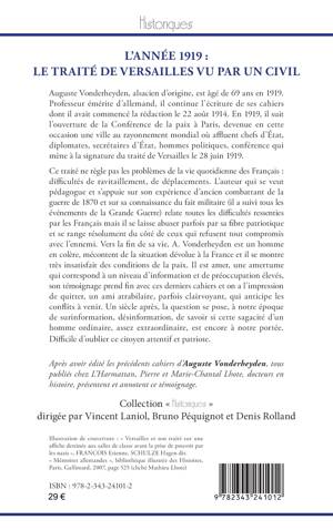 Poursuivant l’écriture de ses cahiers dont il avait commencé la rédaction le 22 août 1914, Auguste Vonderheyden suit l’ouverture de la Conférence de la paix à Paris qui mène à la signature du traité de Versailles le 28 juin 1919. Ce traité ne règle pas les problèmes de la vie quotidienne des Français. L'auteur relate toutes les difficultés ressenties par la population mais il se laisse abuser parfois par sa fibre patriotique et se range résolument du côté de ceux qui refusent tout compromis avec l’ennemi. Les conditions de la paix le laissent mécontent et amer, une amertume qui correspond à un niveau d’information et de préoccupation élevés ; son témoignage prend fin avec ces derniers cahiers et on a l’impression de quitter un ami atrabilaire, parfois clairvoyant, qui anticipe les conflits à venir.