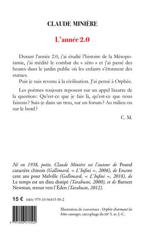 Durant l’année 2.0, j’ai étudié l’histoire de la Mésopotamie, j’ai médité le combat du “zéro” et j’ai passé des heures dans le jardin public où les enfants s’étonnent des statues. Puis je suis revenu à la civilisation. J’ai pensé à Orphée. Les poèmes toujours reposent sur un appel bizarre de la questionâ: Qu’est-ce que je fais là, qu’est-ce que nous faisonsâ? Suis-je dans un trou, sur un forumâ? Au milieu ou sur le bordâ?<br /> C. M.