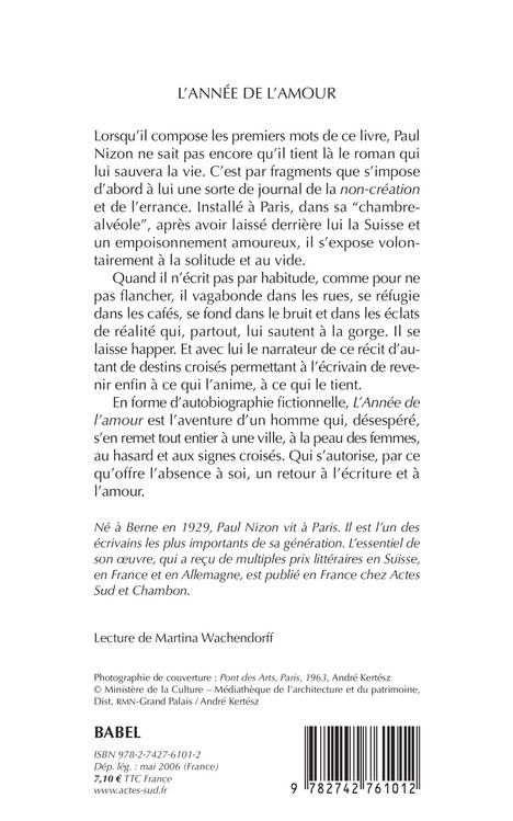 Lorsqu'il compose les premiers mots de ce livre, Paul Nizon ne sait pas encore qu'il tient là le roman qui lui sauvera la vie. C'est par fragments que s'impose d'abord à lui une sorte de journal de la "non-création" et de l'errance. Installé à Paris, dans sa "cham bre- alvéole", après avoir laissé derrière lui la Suisse et un empoisonnement amoureux, il s'expose volontairement à la solitude et au vide. Quand il n'écrit pas par habitude, comme pour ne pas flancher, il vagabonde dans les rues, se réfugie dans les cafés, se fond dans le bruit et dans les éclats de réalité qui, partout, lui sautent à la gorge. Il se laisse happer. Et avec lui le narrateur de ce récit d'autant de destins croisés permettant à l'écrivain de revenir enfin à ce qui l'anime, à ce qui le tient. En forme d'autobiographie fictionnelle, "L'Année de l'amour" est l'aventure d'un homme qui, désespéré, s'en remet tout entier à une ville, à la peau des femmes, au hasard et aux signes croisés. Qui s'autorise, par ce qu'offre l'absence à soi, un retour à l'écriture et à l'amour.