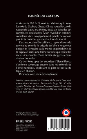 Après avoir fêté le Nouvel An chinois qui ouvre l'année du Cochon, Chesca Olmo, nouvelle coordinatrice de la BAC madrilène, disparaît dans des circonstances inquiétantes. À son réveil d'un sommeil comateux, dans un appartement qu'elle ne connaît pas, trois hommes gravitent autour de son lit... L'ex-inspectrice Elena Blanco reprend alors du service au sein de la brigade qu'elle a longtemps dirigée. Et l'enquête va la mener en périphérie de la capitale, dans une ferme sordide qui recèle les secrets inavouables d'une famille dangereusement dysfonctionnelle. Ce troisième opus des enquêtes d'Elena Blanco s'enfonce davantage encore dans les tréfonds de l'âme humaine, explorant la part de bestialité tapie en chacun. Personne n'en reviendra indemne.