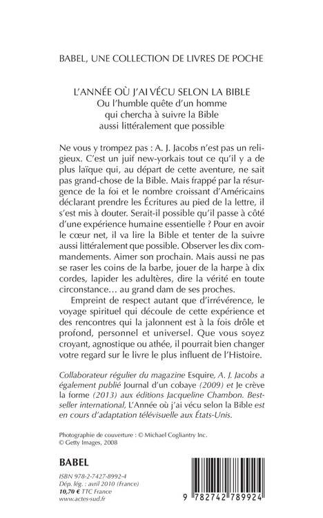 Ne vous y trompez pas : A. J. Jacobs n'est pas un religieux. C'est un juif new-yorkais tout ce qu'il y a de plus laïque qui, au départ de cette aventure, ne sait pas grand-chose de la Bible. Mais frappé par la résurgence de la foi et le nombre croissant d'Américains déclarant prendre les Ecritures au pied de la lettre, il s'est mis à douter. Serait-il possible qu'il passe à côté d'une expérience humaine essentielle ? Pour en avoir le coeur net, il va lire la Bible et tenter de la suivre aussi littéralement que possible. Observer les dix commandements. Aimer son prochain. Mais aussi ne pas se raser les coins de la barbe, jouer de la harpe à dix cordes, lapider les adultères, dire la vérité en toute circonstance... au grand dam de ses proches. Empreint de respect autant que d'irrévérence, le voyage spirituel qui découle de cette expérience et des rencontres qui la jalonnent est à la fois drôle et profond, personnel et universel. Que vous soyez croyant, agnostique ou athée, il pourrait bien changer votre regard sur le livre le plus infl uent de l'Histoire.