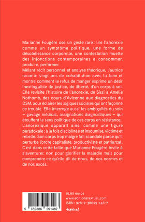 À la croisée du récit intime et de l'essai politique, ce livre renouvelle radicalement notre compréhension de l'anorexie. Marianne Fougère y lit moins un trouble individuel qu'un symptôme du capitalisme, une désobéissance corporelle face aux injonctions à consommer, produire, performer. Dans une langue incarnée et nourrie de références littéraires et féministes, elle dévoile l'anorexique comme une figure paradoxale : à la fois victime et rebelle, corps en résistance qui interroge notre rapport au soin, au désir et à la société de l'abondance.