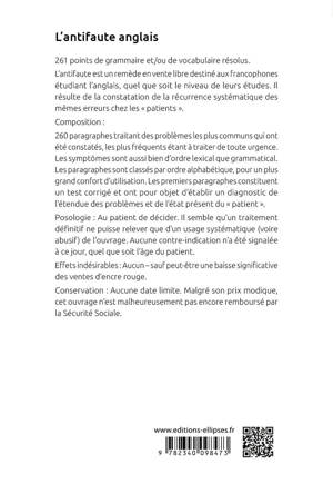 L'antifaute est un remède en vente libre destiné aux francophones étudiant l'anglais, quel que soit le niveau de leurs études. Il résulte de la constatation de la récurrence systématique des mêmes erreurs chez les "patients".