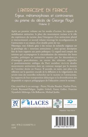 Après un premier volume sur les modes d'action, les espaces de mobilisation antiraciste, la place des mouvements sociaux et le rôle des expériences du racisme dans l'émergence d'un antiracisme pluriel et intersectionnel, ce second volume interroge les reconfigurations de l'antiracisme et ses enjeux, d'un double point de vue. Historique, tout d'abord, grâce à des travaux de recherche originaux sur la généalogie des « nouveaux antiracismes », ainsi qu'une description _ ne de leurs rapports aux partis politiques. Ce regard rend compte des tensions qui accompagnent la réactualisation des mémoires des luttes sociales, politiques et antiracistes menées par les descendant.e.s d'immigrés postcoloniaux, ou encore des relations originelles et positionnements ambigus du Parti socialiste vis-à-vis desdits mouvements antiracistes dans un contexte marqué par la montée de l'extrême droite en France. Il accorde, en outre, une place à la réflexion sur la question cruciale de la diffusion et la vulgarisation des savoirs issus des nouvelles recherches sur le racisme et l'antiracisme, les supports de leur transposition didactique et la diversification des dispositifs et espaces pédagogiques de l'éducation contre le racisme.