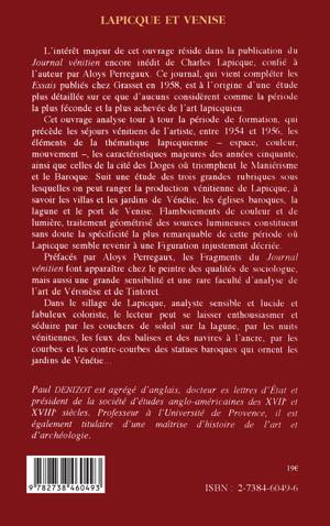 L'édition de ce journal encore inédit de Charles Lapicque permet de suivre l'artiste au cours de sa période de formation qui précède les séjours vénitiens de l'artiste entre 1954 et 1956, de comprendre les éléments de la thématique lapicquienne - espace, couleur, mouvement- ainsi que les éléments majeurs des années cinquante, de même que celles de la cité des Doges où triomphent le Maniérisme et le Baroque. Flamboiements de couleur et de lumière, traitement géométrisé des sources lumineuses constituent sans doute la spécificité la plus remarquable de cette période où Lapicque semble revenir à une figuration injustement décriée.