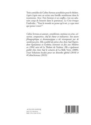 Trois comédies de Coline Serreau actualisées pour le théâtre. «Lapin Lapin» met en scène une famille nombreuse dans la tourmente. Avec «Trois hommes et un couffin», c'est un salutaire coup de boutoir dans le patriarcat. «La Crise» évoque l'individu : "Tout le monde ne pense qu'à soi, y a que moi qui pense à moi !"