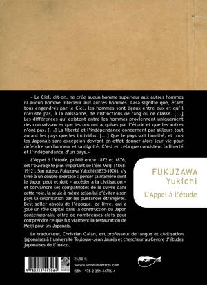 Le Ciel, dit-on, ne cree aucun homme superieur aux autres hommes ni aucun homme inferieur aux autres hommes. Cela signifie que, etant tous engendres par le Ciel, les hommes sont egaux entre eux et qu'il n'existe pas, a la naissance, de distinctions de rang ou de classe. [...] Les differences qui existent entre les hommes proviennent uniquement des connaissances que les uns ont acquises par l'etude et que les autres n'ont pas. [...] La liberte et l'independance concernent par ailleurs tout autant les pays que les individus. [...] Que le pays soit humilie, et tous les Japonais sans exception devront en effet donner alors leur vie pour defendre son honneur et sa dignite. C'est en cela que consistent la liberte et l'independance d'un pays.L'Appel a l'etude, publie entre 1872 et 1876, est l'ouvrage le plus important de l'ere Meiji (1868-1912). Son auteur, Fukuzawa Yukichi (1835-1901), s'y livre a un double exercice: penser la maniere dont le Japon peut et doit acceder a la civilisation et convaincre ses compatriotes de le suivre dans cette voie, la seule a meme selon lui d'eviter a son pays la colonisation par les puissances etrangeres. Best-seller absolu de l'epoque, ce livre, qui a joue un role capital dans la construction du Japon contemporain, offre de nombreuses clefs pour comprendre ce que fut vraiment la restauration de Meiji pour les Japonais.