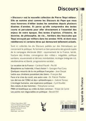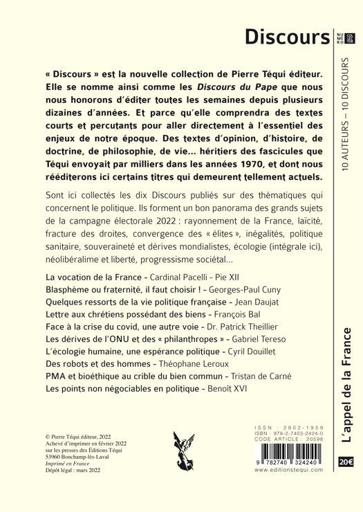 Sont ici collectés les dix Discours publiés sur des thématiques qui concernent le politique. Ils forment un bon panorama des grands sujets de la campagne électorale 2022 : rayonnement de la France, laïcité, fracture des droites, convergence des « élites », inégalités, politique sanitaire, souveraineté et dérives mondialistes, écologie (intégrale ici), néolibéralime et liberté, progressisme sociétal…