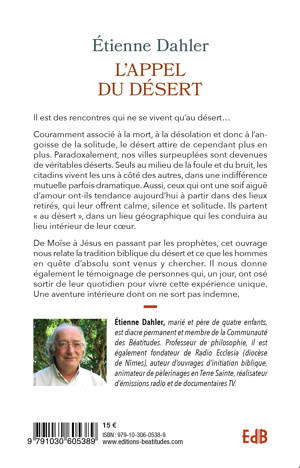 Il est des rencontres qui ne se vivent qu’au désert. Couramment associé à la mort, la désolation, et donc l’angoisse de la solitude, le désert attire cependant de plus en plus. Paradoxalement, nos villes surpeuplées sont devenues pour beaucoup de véritables déserts qui engendrent dépression et angoisse. Seuls au milieu de la foule et du brouhaha, les citadins vivent les uns à côté des autres, dans une ignorance mutuelle parfois dramatique. Aussi ceux qui ont une soif aiguë d’amour ont-ils tendance aujourd’hui à partir à sa recherche dans des lieux retirés, d’une certaine manière, ils partent « au désert », dans un lieu qui les conduira au lieu intérieur de leur cœur. De Moïse à Jésus en passant par les prophètes, cet ouvrage nous relate la tradition biblique du désert. Il nous donne également le témoignage de personnes comme vous et moi qui, un jour, ont osé sortir de leur quotidien pour vivre un temps cette expérience d’absolu. Une aventure intérieure dont on ne sort pas indemne…