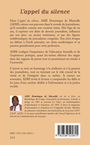Dans L'appel du silence, ASIE Dominique de Marseille (ADM), retrace son parcours dans le monde du journalisme, qu'il considère comme une vocation innée. Dès l'âge de six ans, il exprime son désir de devenir journaliste, influencé par son père, un ancien instituteur, et par des figures emblématiques du journalisme congolais. Son récit évoque ses débuts à l'école primaire, ses choix académiques et sa passion grandissante pour cette profession. ADM souligne l'importance de l'éducation formelle et de l'expérience pratique, ayant lui-même effectué des stages dans des organes de presse tout en poursuivant ses études à l'université. L'oeuvre se veut un hommage à la résilience et à la passion des journalistes, tout en insistant sur le rôle crucial de la vérité et de l'intégrité dans ce métier. À travers ses souvenirs, ADM invite le lecteur à comprendre les défis et les joies d'une carrière dédiée à l'information et à la justice sociale.