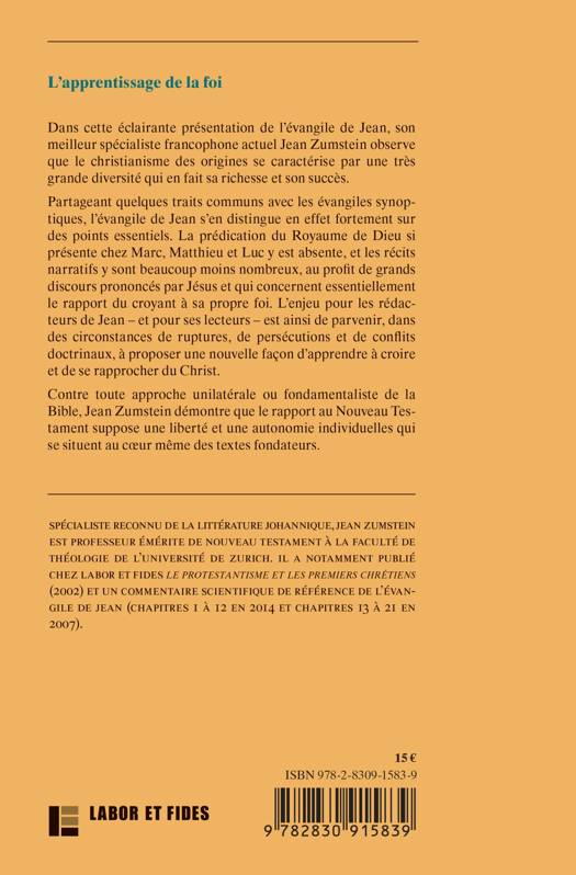 Partageant quelques traits communs avec les évangiles synoptiques, l'?évangile de Jean s?'en distingue fortement sur des points essentiels. La prédication du Royaume de Dieu si présente chez Marc, Matthieu et Luc y est absente et les récits narratifs y sont beaucoup moins nombreux au profit de grands discours prononcés par Jésus et qui concernent essentiellement le rapport du croyant à sa propre foi. Faut-il privilégier cet écrit ou au contraire le mettre de côté ? Dans cette présentation très éclairante de l?'évangile de Jean et de l?'école johannique, son meilleur spécialiste francophone actuel Jean Zumstein observe que le christianisme des origines se caractérise par une très grande diversité qui en fait sa richesse et son succès. Contre toute approche unilatérale ou fondamentaliste de la Bible, il démontre que le rapport au Nouveau Testament suppose une liberté et une autonomie individuelles qui se situent au c?œur même des textes fondateurs.