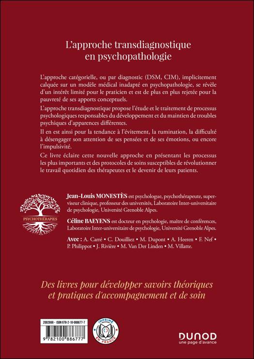L'approche catégorielle, ou par diagnostic, (DSM, CIM) implicitement calquée sur un modèle médical inadapté en psychopathologie, est d'un intérêt limité pour le praticien et est rejetée par un nombre croissant de thérapeutes et de chercheurs pour la pauvreté de ses apports conceptuels. Face à ces limites, l'approche transdiagnostique reçoit une attention croissante. Elle considère que les processus psychologiques responsables des troubles psychologiques sont communs à tous les troubles d’apparence très différents. Parmi ces processus, on trouve la tendance à l’évitement, la rumination, la difficulté à désengager son attention de ses pensées et de ses émotions, ou encore l’impulsivité. Sur la base de ces travaux, des protocoles de soins commencent à être proposés et évalués, et pourraient révolutionner le travail quotidien des thérapeutes comme le devenir des patients qu’ils prennent en charge.