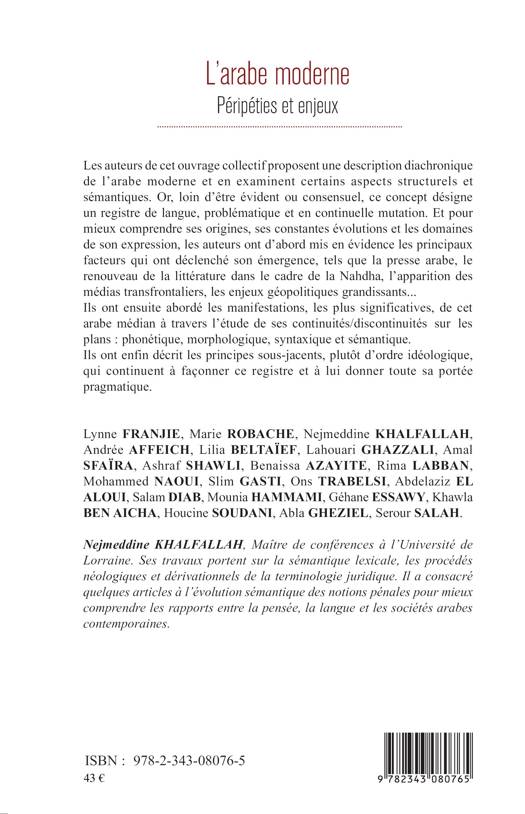 Cet ouvrage rassemble des contributions autour de la question de l'arabe moderne, registre de langue médian et en constante mutation. Les auteurs mettent en évidence les principaux facteurs de son apparition, puis analysent les particularités phonétiques, morphologiques, syntaxiques et sémantiques. Enfin, ils décrivent les principes idéologiques qui président à son usage.