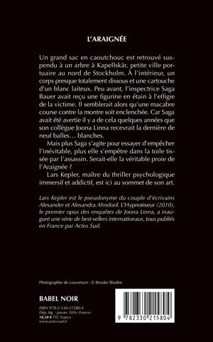 Un grand sac en caoutchouc est retrouvé suspendu à un arbre à Kapellskär, petite ville portuaire au nord de Stockholm. À l'intérieur, un corps presque totalement dissous et une cartouche d'un blanc laiteux. Peu avant, l'inspectrice Saga Bauer avait reçu une figurine en étain à l'effigie de la victime. Il semblerait alors qu'une macabre course contre la montre soit enclenchée. Car Saga avait été avertie il y a de cela quelques années que son collègue Joona Linna recevrait la dernière de neuf balles... blanches. Mais plus Saga s'agite pour essayer d'empêcher l'inévitable, plus elle s'empêtre dans la toile tissée par l'assassin. Serait-elle la véritable proie de l'Araignée ? Lars Kepler, maître du thriller psychologique immersif et addictif, est ici au sommet de son art.