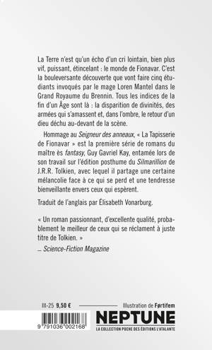 La Terre n'est qu'un écho d'un cri lointain, bien plus vif, puissant, étincelant : le monde de Fionavar. C'est la bouleversante découverte que vont faire cinq étudiants invoqués par le mage Loren Mantel dans le Grand Royaume du Brennin. Tous les indices de la fin d'un Âge sont là : la disparition de divinités, des armées qui s'amassent et, dans l'ombre, le retour d'un dieu déchu au-devant de la scène. Hommage au Seigneur des anneaux, « La Tapisserie de Fionavar » est la première série de romans du maître ès fantasy, Guy Gavriel Kay, entamée lors de son travail sur l'édition posthume du Silmarillion de J. R. R. Tolkien, avec lequel il partage une certaine mélancolie face à ce qui se perd et une tendresse bienveillante envers ceux qui espèrent.