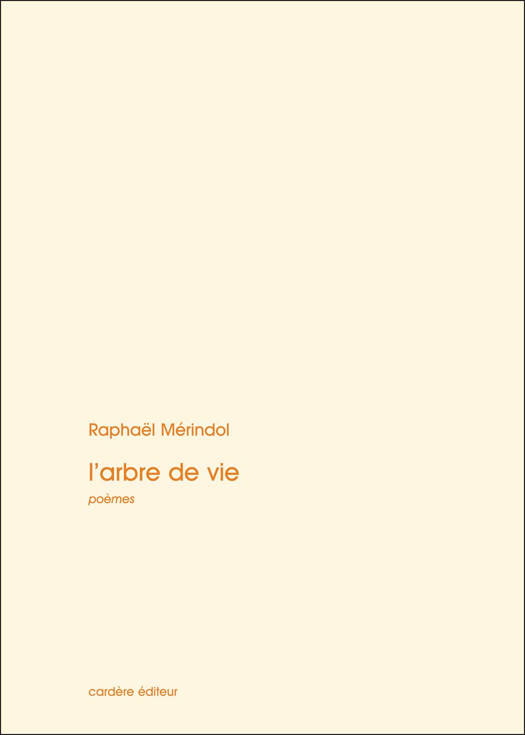 Recherchant dans le poème la précision et la concision, comme l’élégance et la musicalité, Raphaël Mérindol exalte en la condensant une mélancolie ancrée dans l’instant. L’Arbre de vie, dédié à son jeune fils Kléber-Henri, publié en juillet 2013 par Cardère éditeur, ne dévie pas de cette ligne poétique, épurée jusqu’à une forme proche du haïku. Le recueil, comme son nom l’indique, est un éloge à un personnage que l’auteur admire – vénère ? –, l’arbre, ou plutôt les arbres dans leur diversité de caractères. Quatre peintres provençaux à la notoriété solidement établie – Pierre Cayol, Christian Jauréguy, Jean-Pierre Péransin et Le Zhang (artiste qui partage son temps entre la cité des Papes et Pékin) – se sont prêtés au jeu de l’illustration de trois poèmes chacun, par amitié pour l’auteur.