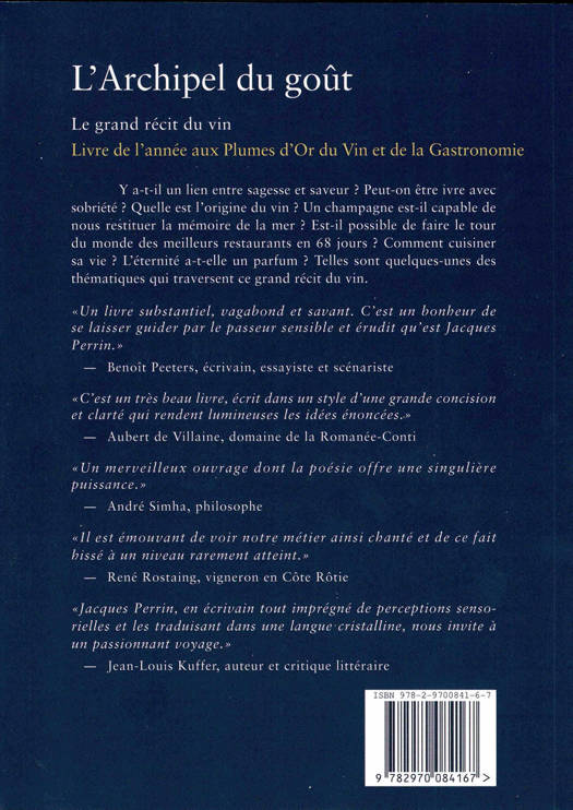 L'Archipel du goût Le grand récit du vin Livre de l'année aux Plumes d'Or du Vin et de la Gastronomie Y a-t-il un lien entre sagesse et saveur ? Peut-on être ivre avec sobriété ? Quelle est l'origine du vin ? Un champagne est-il capable de nous retituer la mémoire de la mer ? Est-il possible de faire le tour du monde des meilleurs restaurants en 68 jours.? Comment cuisiner sa vie ? L'éternité a-t-elle un parfum ? Telles sont quelques-unes des thématiques qui traversent ce grand récit du vin. «Un livre substantiel, vagabond et savant. C'est un bonheur de se laisser guider par le passeur sensible et érudit qu'est Jacques Perrin. » Benoît Peeters, écrivain, 'essayiste et scénariste «C'est un très beau livre, écrit dans un style d'une grande concision et clarté qui rendent lumineuses les idées énoncées.» - Aubert de Villaine, domaine de la Romanée-Conti «Un merveilleux ouvrage dont la poésie offre une singulière puissance. » - André Simha, philosophe «Il est émouvant de voir notre métier ainsi chanté et de ce fait hissé à un niveau rarement atteint.» - René Rostaing, vigneron en Côte Rôtie «Jacques Perrin, en écrivain tout imprégné de perceptions sensorielles et les traduisant dans une langue cristalline, nous invite à un passionnant voyage.» - Jean-Louis Kuffer, auteur et critique littéraire