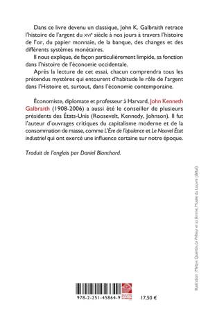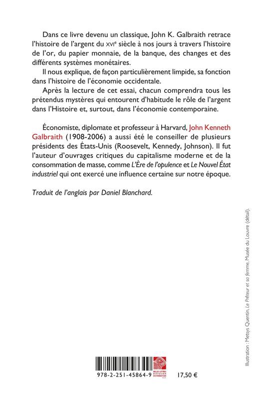 Dans ce livre devenu un classique, John K. Galbraith retrace l’histoire de l’argent du XVIe siècle à nos jours à travers l’histoire de l’or, du papier monnaie, de la banque, des changes et des différents systèmes monétaires.