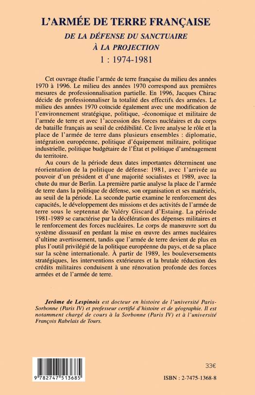 Ce livre analyse le rôle et la place de l'armée de terre dans plusieurs ensembles : diplomatie, intégration européenne, politique d'équipement militaire, politique industrielle, politique budgétaire de l'Etat et politique d'aménagement. Du milieu des années 70 à 1996, deux dates importantes réorienteront complètement la politique de défense : 1981 et l'arrivée au pouvoir d'un président socialiste et 1989 avec la chute du mur de Berlin.