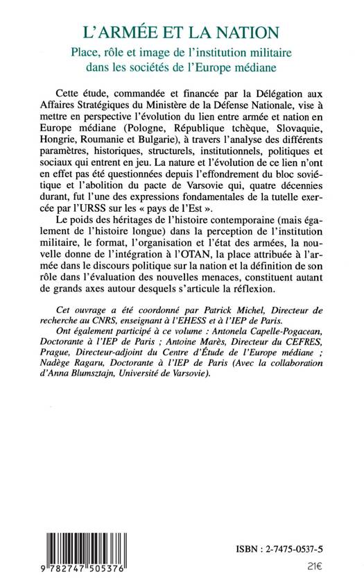 Cette étude vise à mettre en perspective l'évolution du lien entre armée et nation en Europe médiane (Pologne, République Tchèque, Slovaquie, Hongrie, Roumanie et Bulgarie) à travers les différents paramètres, historiques, structurels, institutionnels, politiques et sociaux qui entrent en jeu. La nature et l'évolution de ce lien n'ont en effet pas été questionnés depuis l'effondrement du bloc soviétique et l'abolition du pacte de Varsovie.