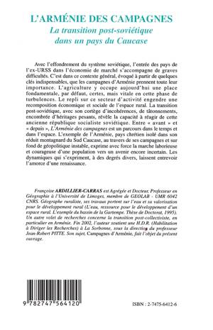 Avec l'effondrement du système soviétique, l'entrée des pays de l'ex-URSS dans l'économie de marché s'accompagne de graves difficultés. C'est dans ce contexte que les campagnes d'Arménie prennent toutes leur importance. L'agriculture y occupe aujourd'hui une place fondamentale, par défaut, certes, mais vitale en cette phase de turbulences. Le repli sur ce secteur d'activité engendre une recomposition économique et sociale de l'espace rural. La transition post-soviétique, malgré son cortège d'incohérences et de tâtonnements, révèle la capacité à réagir de cette ancienne république socialiste soviétique.