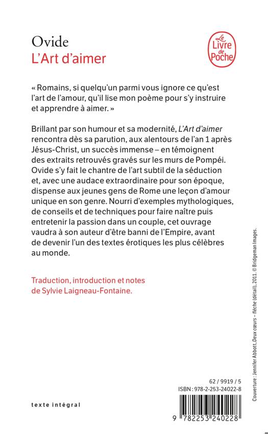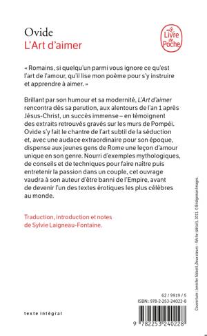 Brillant par son humour et sa modernité, L’Art d’aimer rencontra dès sa parution aux alentours de l’an 1 apr. J.-C. un succès immense – en témoignent des extraits retrouvés gravés sur les murs de Pompéi. Ovide s’y fait le chantre de l’art subtil de la séduction et, avec une audace extraordinaire pour son époque, dispense aux jeunes gens de Rome une leçon d’amour dans les règles de l’art. Nourri d’exemple mythologiques, de conseils et de techniques pour faire naître puis entretenir la passion dans son couple, L’Art d’aimer vaudra à son auteur d’être banni de l’Empire, avant de devenir l’un des textes érotiques les plus célèbres au monde.