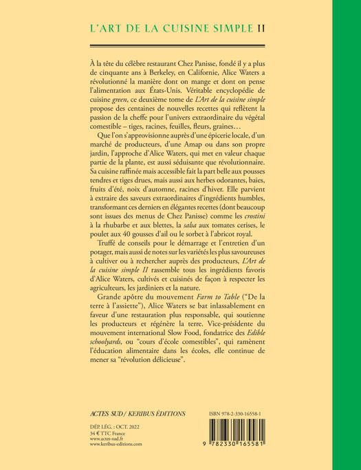 Deuxième tome de L'Art de la cuisine simple d'Alice Waters, cheffe, autrice et activiste américaine, Alice qui a fondé le restaurant Chez Panisse à Berkeley, Californie.