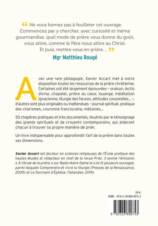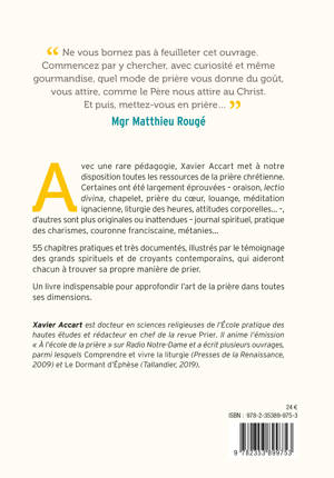 Avec une rare pédagogie, Xavier Accart met à notre disposition les plus belles méthodes de prière puisées dans la tradition de lÉglise. Certaines ont été largement éprouvées oraison, lectio divina, chapelet, prière de Jésus, louange, attitudes corporelles, exercices de saint Ignace... , dautres sont plus originales ou inattendues journal spirituel, prier avec les intentions du pape, pratique des charismes, scapulaire, métanies... 50 chapitres pratiques et concis, illustrés par le témoignage des grands spirituels et de croyants daujourdhui. Un livre indispensable pour approfondir lart de la prière dans toutes ses dimensions. A propos de l'auteur : Né en 1971, Xavier Accart est docteur en sciences religieuses et rédacteur en chef de la revue Prier. Il anime lémission hebdomadaire « À lécole de la prière » sur Radio Notre-Dame et a écrit plusieurs ouvrages, parmi lesquels Comprendre et vivre la liturgie (Presses de la Renaissance, 2009) et Le Dormant dÉphèse (Tallandier, 2019).