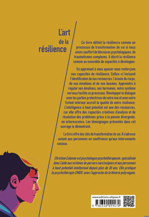 Ce livre définit la résilience comme un processus de transformation de soi si nous avons souffert de blessures psychologiques, de traumatismes complexes. Il décrit la résilience comme un ensemble de capacités à développer. La théorie polyvagale de S. Porgès offre ce modèle. Elle démontre que la résilience est le sentiment de sécurité dans le lien avec soi et avec autrui. En apprenant à nous apaiser nous renforçons nos capacités de résilience. Celles-ci incluent l’identification de nos ressources, l’écoute du corps, de nos émotions et de nos besoins. Apprendre à réguler nos émotions, nos hormones, notre système nerveux facilite ce processus. Développer le dialogue avec les parties protectrices de notre moi et avec notre Enfant intérieur accroît la qualité de notre résilience. L’intelligence à haut potentiel est une des ressources, car elle offre des capacités créatives d’analyse et de résolution des problèmes grâce à la pensée divergente, en arborescence. Le témoignage de mes patients le démontre. Le livre offre des clés de transformation de soi. Il s’adresse autant aux personnes en souffrance qu’aux intervenants sociaux.