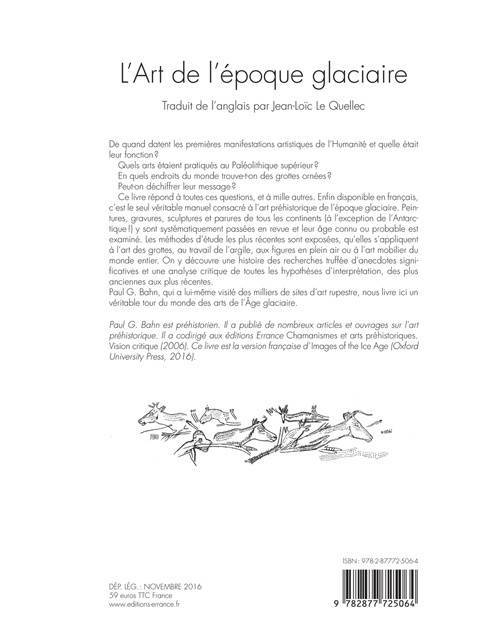 De quand datent les premières manifestations artistiques de l'Humanité et quelle était leur fonction ? Quels arts étaient pratiqués au Paléolithique supérieur ? En quels endroits du monde trouve-t-on des grottes ornées ? Peut-on déchiffrer leur message ? Ce livre répond à toutes ces questions, et à mille autres. Enfin disponible en français, c'est le seul véritable manuel consacré à l'art préhistorique de l'époque glaciaire. Peintures, gravures, sculptures et parures de tous les continents (à l'exception de l'Antarctique !) y sont systématiquement passées en revue et leur âge connu ou probable est examiné. Les méthodes d'étude les plus récentes sont exposées, qu'elles s'appliquent à l'art des grottes, au travail de l'argile, aux figures en plein air ou à l'art mobilier du monde entier. On y découvrira une histoire des recherches truffée d'anecdotes significatives et une analyse critique de toutes les hypothèses d'interprétation, des plus anciennes aux plus récentes. Paul Bahn, qui a lui-même visité des milliers de sites d'art rupestre, nous livre ici un véritable tour du monde des arts de l'Âge Glaciaire.