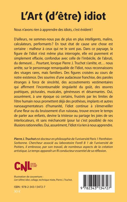 Qu'est-ce qu'un idiot ? Pourquoi cette figure est-elle digne d'intérêt ? L'idiot n'est peut-être pas le personnage que l'on croit. Il est loin d'être crétin, imbécile ou débile ! L'idiot est cet être fort qui agit de lui-même contre vent et marée, qui de sa propre initiative se comporte et crée en fonction de règles qu'il s'est lui-même prescrites. L'idiot, c'est cet être intelligent qui n'a pas besoin de le prouver mais qui incite les autres à s'interroger sur leur propre mode de vie et cela à son insu.