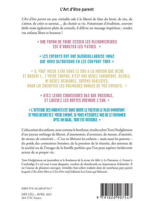 Avec son style empreint d'humour et de références pop/philosophiques, et dans la lignée de ces précédents ouvrages - comme «L'art d'être oisif...dans un monde de dingue» ou« L'art d'être libre...dans un monde absurde »- Tom Hodgkinson revient avec un ouvrage rafraichissant et déculpabilisant sur la posture de parents !