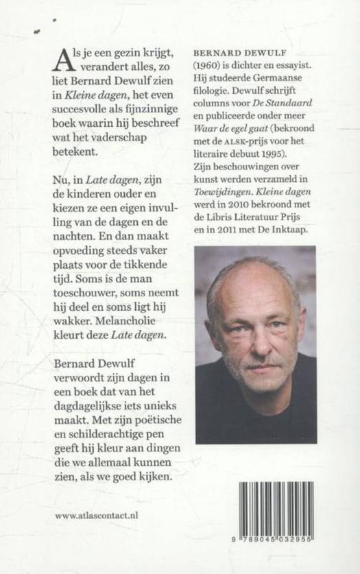 Vanzelfsprekend bouwen ze geen kastelen meer. Die liggen verdeeld op zolder, naast de ridders, Zorro en het vee. Voor later. Nu komen en gaan ze. Nu laten ze grotere gaten achter. Nu weet ik soms niet hoeveel borden ik op onze tafel moet zetten 's ochtends. Soms zijn het er twee, soms blijkbaar zeven. Als je een gezin krijgt, verandert alles, zo liet Bernard Dewulf zien in Kleine dagen, het even succesvolle als fijnzinnige boek waarin hij beschreef wat het vaderschap betekent. Nu, in Late dagen, zijn de kinderen ouder en kiezen ze een eigen invulling van de dagen en de nachten. En dan maakt verwondering steeds vaker plaats voor de opvoeding. Soms is de vader toeschouwer en soms ligt hij wakker. Soms is het zomer, altijd weer wordt het herfst. Melancholie kleurt deze Late dagen. Bernard Dewulf telt zijn eigen dagen in een boek dat van het 'dagdagelijkse' iets unieks maakt. Met zijn poëtische en schilderachtige pen geeft hij kleur aan dingen die we allemaal kunnen zien, als we goed kijken.