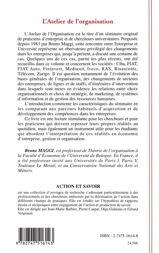 L'Atelier de l'organisation est le titre d'un séminaire original de praticiens d'entreprise et de chercheurs universitaires. Cette rencontre entre Entreprise et Université présente un observatoire privilégié des changements dans les entreprises et qui concerne les entreprises : Ciba, FIAT, Fininvest, Rinascente, Auto, Iveco, Télécom… Il est question notamment de l'évolution des bases générales de l'organisation, des changements de secteurs des entreprises, de lignes et de staffs, d'itinéraires d'intervention dans lesquels sont mises en évidence les relations entre choix organisationnels et choix de stratégie, de marketing, de systèmes d'information et de gestion des ressources humaines.
