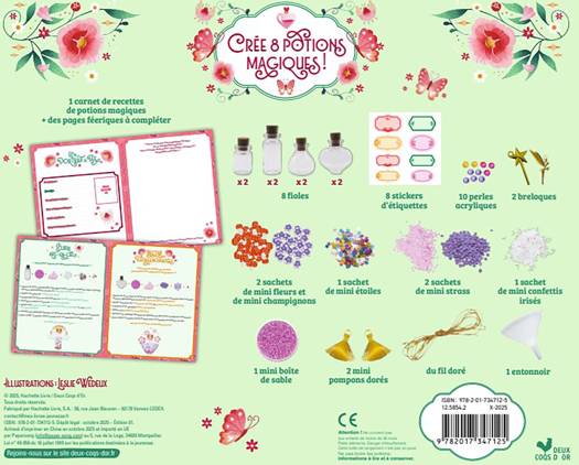 Une boîte proposant tout le contenu pour créer des petites fioles magiques de fées ! Un livre contenant des recettes magiques sous la forme de pas-à-pas pour remplir les fioles. Retrouvez le nécessaire pour que votre enfant s'amuse en toute autonomie !