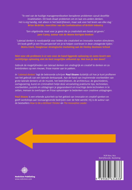 In ‘Lateraal denken voor elke dag’ legt de bekroonde schrijver Paul Sloane duidelijk uit hoe je kunt profiteren van het gebruik van een laterale denkaanpak. Aan de hand van inspirerende voorbeelden van grote laterale denkers uit de muziek, het bedrijfsleven, de architectuur, de geschiedenis, oorlogvoering, kunst en criminaliteit helpt deze verzameling praktische tips, technieken, voorbeelden, puzzels en uitdagingen je gegarandeerd om krachtige denk-technieken in te zetten, mensen te overtuigen en frisse oplossingen te bedenken voor creatieve uitdagingen. Paul Sloane is een erkende autoriteit op het gebied van innovatie en creatief spreken en geeft workshops aan toonaangevende bedrijven over de hele wereld. Hij is de auteur van de bestsellers ‘How to Be a Brilliant Thinker’ en ‘The Innovative Leader’.