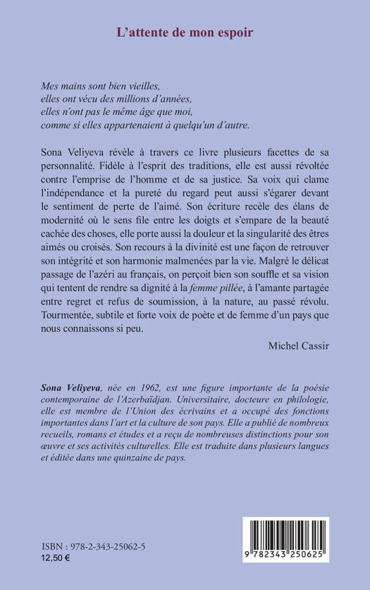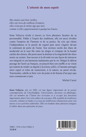 Mes mains sont bien vieilles, elles ont vécu des millions d’années, elles n’ont pas le même âge que moi, comme si elles appartenaient à quelqu’un d’autre. Sona Veliyeva révèle à travers ce livre plusieurs facettes de sa personnalité. Fidèle à l’esprit des traditions, elle est aussi révoltée contre l’emprise de l’homme et de sa justice. [...] Malgré le délicat passage de l’azéri au français, on perçoit bien son souffle et sa vision qui tentent de rendre sa dignité à la femme pillée, à l’amante partagée entre regret et refus de soumission, à la nature, au passé révolu. Tourmentée, subtile et forte voix de poète et de femme d’un pays que nous connaissons si peu. - Michel Cassir